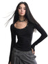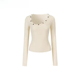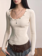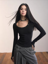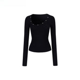 The Studded Asymmetric U-Neck Knit Top from VIAPITTI is a sleek, body-contouring essential that merges minimalist elegance with contemporary detailing. Crafted from a viscose-cotton blend with added spandex, it offers a soft, skin-friendly touch with moderate elasticity that enhances comfort and movement. The deep U-shaped neckline and asymmetric design highlight the collarbone for a subtly sensual silhouette, while the metallic stud accents add a refined, edgy charm. Designed to sculpt the figure with a clean, streamlined finish, this piece transitions effortlessly from casual layering to elevated evening styling.
