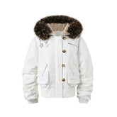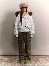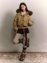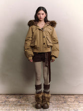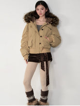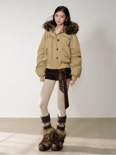 A statement-making bomber down jacket inspired by classic aviator silhouettes, reimagined with a modern Korean touch. Designed with a relaxed fit that flatters all body shapes, it features a detachable plush faux fur collar and tonal studded embellishments for a striking vintage aesthetic. The structured shoulder line and wide hem create a balanced silhouette, while the amber-tone buttons and hardware add sophisticated detail. The jacket combines practicality with streetwear appeal—double front pockets enhance utility, and the voluminous down filling ensures warmth without bulk. Crafted using high-temperature embossed star-patterned studs, it offers long-lasting wear and a subtle textured finish. Soft yet resilient, this piece effortlessly transitions from casual city looks to cozy winter ensembles.