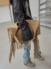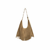 Crafted in a classic large-capacity silhouette, this bag features a saddle-shaped flap with an extended bottom design for added structure and volume. The spacious interior includes a partitioned pocket, balancing functionality with refined style. Hand-cut fringe details flow naturally, exuding a rhythmic sense of movement, while the reinforced studded shoulder strap is paired with custom adjustable metal fittings for a sophisticated and textured finish.