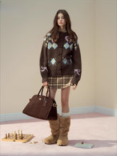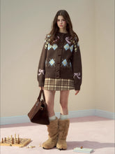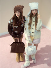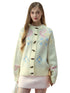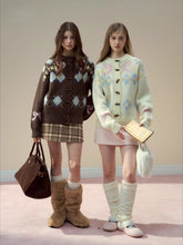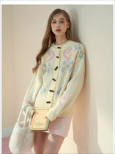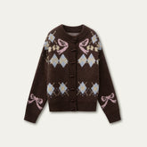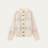 A soft knit cardigan that blends retro charm with sweet femininity. Featuring pastel-toned bow-knot accents woven with classic Fair Isle argyle patterns, it creates a layered, romantic texture reminiscent of garden butterflies in flight. The warm color palette of pale yellow and light blue adds harmony and depth, while the natural wooden toggle buttons bring a rustic, textured finish. With its cozy feel, relaxed silhouette, and detachable design, this piece balances practical wearability with a vintage-inspired aesthetic.