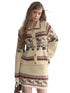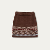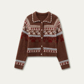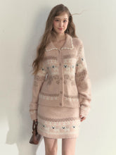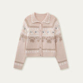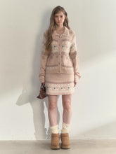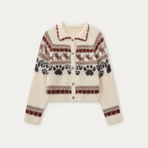 Adorable and cozy, this Fair Isle knit set captures a charming vintage spirit with a playful twist. Made from a soft wool-blend yarn, it offers gentle warmth and a smooth, luminous texture — perfect for autumn and winter days. The slightly relaxed fit flatters all body types, providing both comfort and style. The single-breasted front allows easy wear, while the contrasting hand-wrapped knitted trim adds refined detail and dimension. The cute puppy pattern enhances the cozy cardigan silhouette, infusing it with a touch of girlish charm and warmth. The hand-sewn contrast edging and buttons showcase exquisite craftsmanship. Pair with the matching mini skirt for a complete coordinated look — or wear separately for versatile styling that balances playfulness and sophistication.