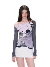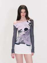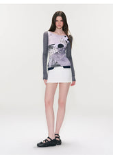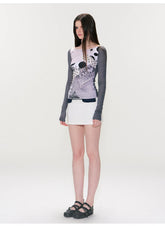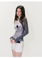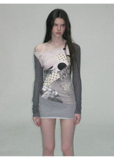 This retro-inspired long-sleeve T-shirt features a striking color-block patchwork design combined with vintage-style graphic details, creating a bold yet wearable statement piece. Designed with a slim, body-contouring fit, it highlights the waist while remaining comfortable for everyday wear. The extended shoulder-sleeve cut adds a subtle streetwear edge, making it ideal as a base layer or worn alone. Suitable for casual outings, commuting, or styled street looks, this top blends individuality with modern versatility.