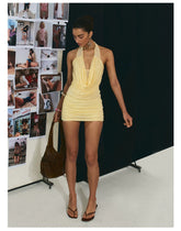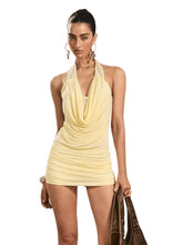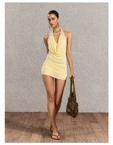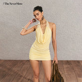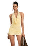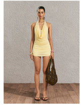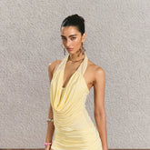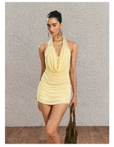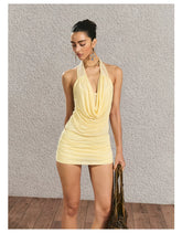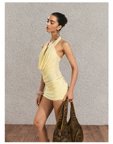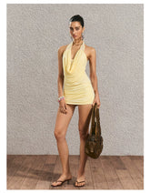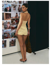 An original French-inspired two-piece set featuring a draped halter-neck sleeveless top paired with a body-skimming gilded print skort. The top is designed with a fluid cowl neckline and an elegant open-back halter silhouette, highlighting the shoulders and back with understated sensuality. The softly contoured fit follows the body naturally, offering comfort with a refined, feminine line. The matching skort combines the look of a hip-hugging mini skirt with the security of built-in shorts, finished with a subtle hot-stamped print that adds depth and a luxurious accent. Light, breathable, and visually striking, this set is ideal for summer styling, vacations, and statement occasions.