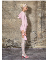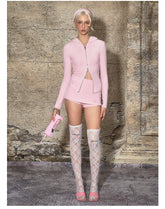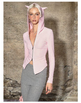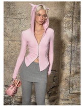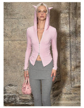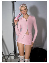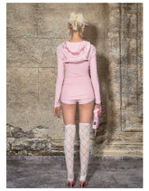 A bold, edgy two-piece knit set designed with a playful “little devil” aesthetic. The fitted hoodie-style jacket features a structured, body-contouring cut that creates a layered, faux two-piece effect, enhancing the waistline and silhouette. Paired with matching skirt-shorts, the set balances sweetness and attitude, delivering a sleek, slim-fit look that’s perfect for statement streetwear or styled daily outfits.