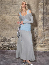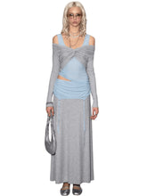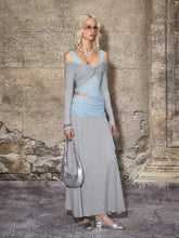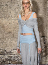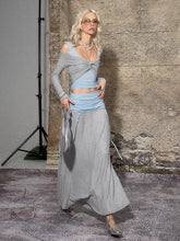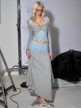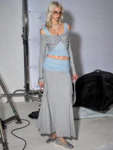 A refined layered knit set designed for transitional seasons, featuring a blue-grey long-sleeve outer top, a cropped camisole inner layer, and a matching high-waist knit maxi skirt. Crafted with a soft, skin-friendly TENCEL™ blend, the set delivers a fluid drape and gentle stretch that contours the body without restriction. The long-sleeve outer top creates a clean, minimal silhouette, while the fitted camisole adds depth through subtle layering. The slim knit skirt elongates the figure with a streamlined cut, offering an elegant yet relaxed aesthetic ideal for everyday wear or elevated casual styling. Designed to be worn together or styled separately, this set balances modern femininity with effortless versatility.
