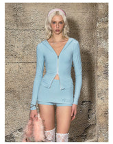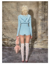 A bold, Y2K-inspired comfort set designed with a sleek “little devil” attitude, featuring a fitted zip-up hoodie paired with a faux two-piece skort. The top is crafted with a body-hugging silhouette and a clean zip-front design, balancing sporty energy with a feminine, curve-enhancing fit. The coordinated skort delivers the look of a skirt with the comfort and security of shorts, creating a playful yet practical styling solution. Soft stretch and a lightweight feel make this set ideal for everyday wear, lounging, or edgy street-style outfits.