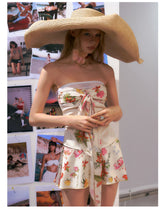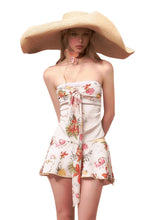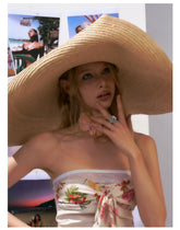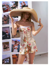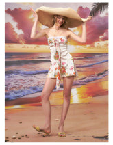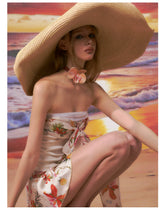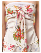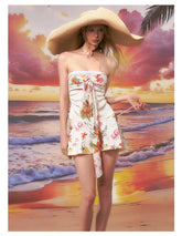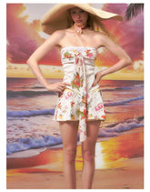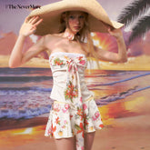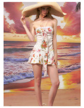 A sensual yet refined two-piece set featuring a printed bandeau top paired with a matching mini skirt, designed to capture a pure, romantic summer mood. The strapless top highlights the shoulders and neckline with a clean, feminine silhouette, finished with extended ties that add movement and visual interest. The fitted cut softly contours the body while maintaining comfort through subtle stretch. The coordinating mini skirt sits high on the waist, balancing the look with a sleek, leg-lengthening proportion. With its warm sunset-inspired print and lightweight feel, this set is ideal for vacation styling, summer outings, or statement occasions.