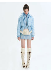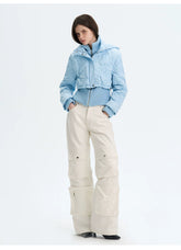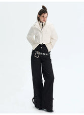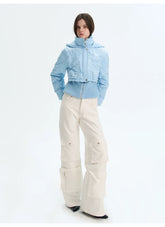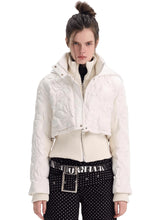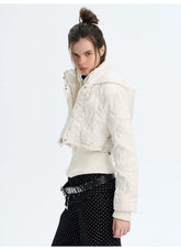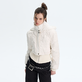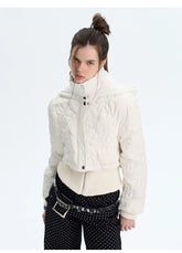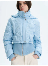 A refined short down jacket designed with elegant quilted embossing that adds texture and dimension to a clean, modern silhouette. Filled with premium 90% white duck down, this piece delivers lightweight warmth while maintaining a streamlined profile. The cropped length enhances proportions, making it ideal for pairing with high-waisted bottoms. Structured shoulders and balanced volume create a polished yet cozy look, blending functional insulation with a subtle vintage-inspired aesthetic perfect for winter styling.