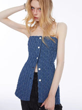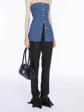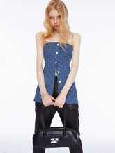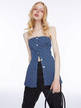 An original, statement-making denim bandeau inspired by a retro, sweet-and-spicy aesthetic. Designed with heavy ruched detailing, this sleeveless camisole top sculpts the body with a structured yet feminine silhouette. The strapless cut highlights the shoulders and neckline, while the stretch-infused denim ensures comfort and a flattering fit. Perfect as a bold summer top or styled with layers for a fashion-forward look.
