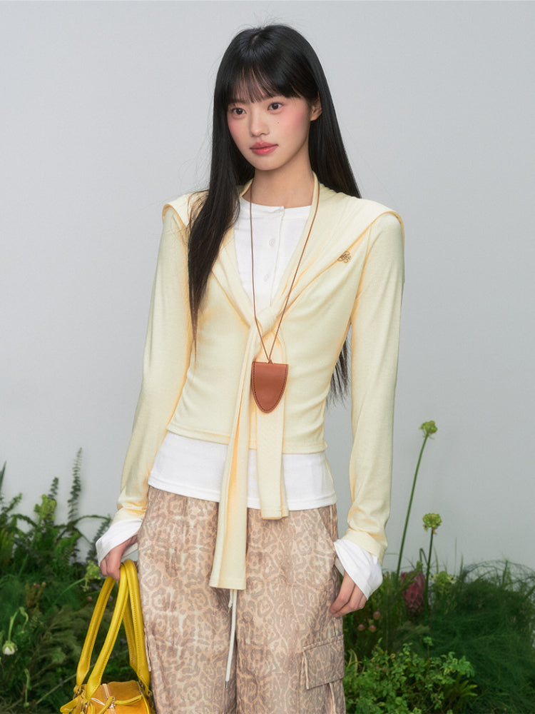 A stylish and comfortable long-sleeve Henley T-shirt featuring a tie-up design. Perfect for layering or wearing as a casual top.