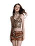 This Y2K-inspired cami top features a bold leopard print accented with shimmering sequins, creating a striking and confident look. Designed with a slim-fit silhouette, it contours the body to enhance curves while maintaining a lightweight, comfortable feel. The camisole cut highlights the neckline and shoulders, delivering a sexy yet refined aesthetic. Ideal for statement styling, it can be worn alone or layered, making it a versatile choice for parties, night outings, or fashion-forward daily wear.
