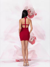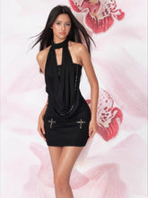 This summer mini dress delivers a bold, sexy statement with a sleek, body-hugging silhouette. Designed with a softly draped neckline, it highlights the collarbone while adding fluid elegance to the look. The cross motif embellished with rhinestones creates a striking focal point, elevating the dress with edgy glamour. Crafted in a stretchy knit fabric, the slim-fit cut contours the waist and hips for a sculpted, flattering finish. Perfect for nights out, parties, or standout summer styling with confident allure.