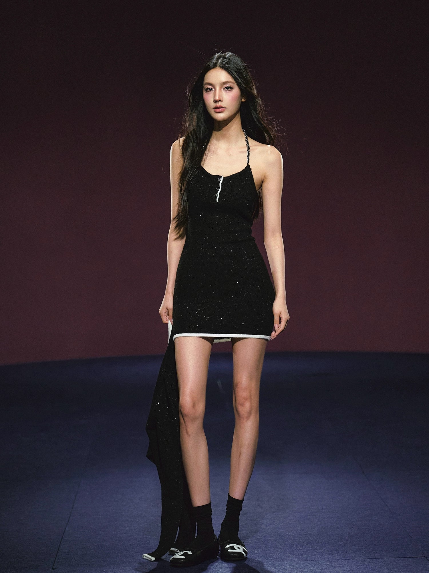 This is a stylish tweed galaxy shimmer chain halter dress. It features an eye-catching halter design with delicate chains, adding a touch of elegance and uniqueness. The fabric has a beautiful shimmer, making it perfect for special occasions or to stand out in daily wear.