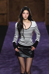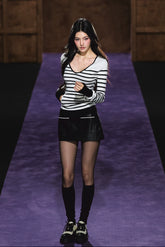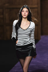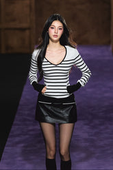 A modern take on the classic tweed aesthetic, this low-waist mini skirt features a sleek faux leather finish with contrast detailing that highlights a chic and structured silhouette. The fitted, hip-hugging cut enhances the figure, while the soft lining ensures comfort and flexibility. Perfect for pairing with knit tops or cropped jackets, this skirt adds a bold, fashion-forward edge to any winter outfit.