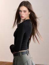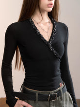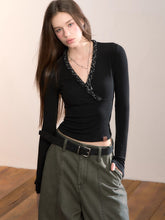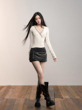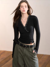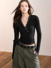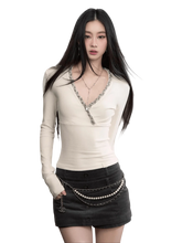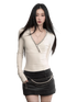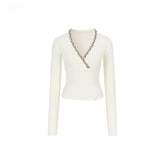 A refined autumn-winter essential crafted with delicate detailing and modern femininity. This slim-fit long-sleeve knit top features a structured V-neck design with contrast woven tape accents for a contemporary layered effect. The soft, breathable knit fabric provides comfort and flexibility, making it ideal for both everyday wear and elegant layering. Perfectly tailored to flatter the silhouette while maintaining a sleek, minimalist aesthetic.