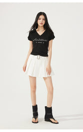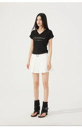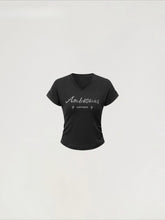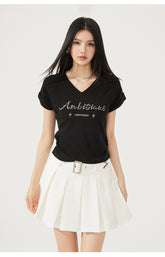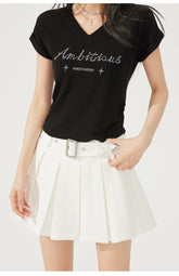 V - neck highlights collarbone, visually slims face. Minimalist letter rhinestone design, eye - catching and unique. High - stretch fabric with drape, a must - have versatile Tee for summer