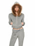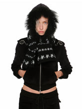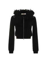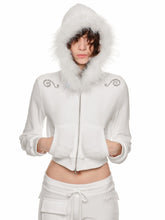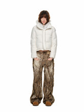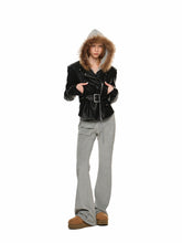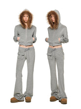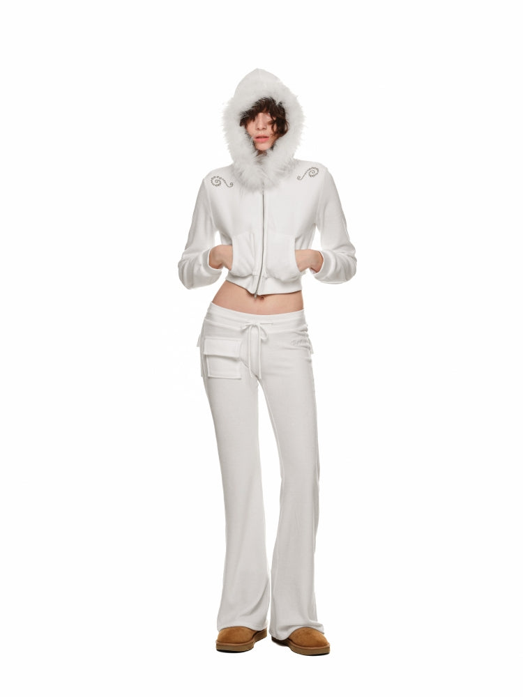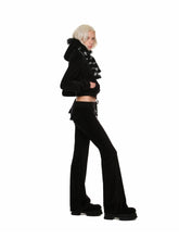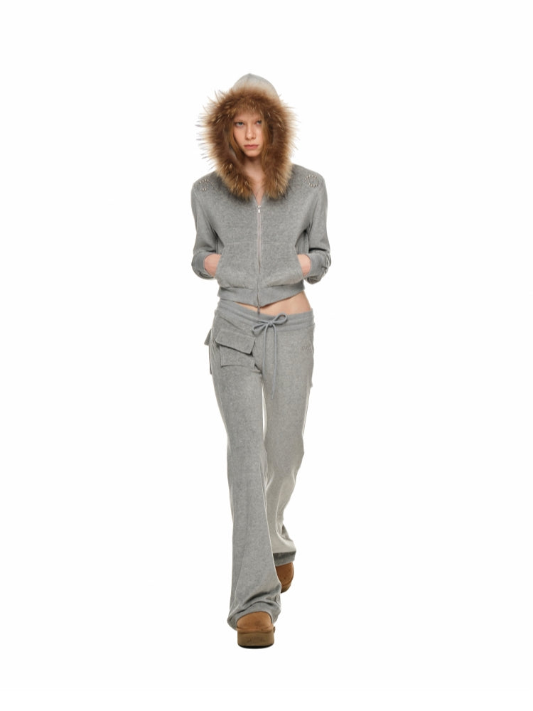 This velvet raccoon fur hoodie set features a short, tailored hooded design with double zipper, enhancing body proportions for a slimmer look. It has a structured natural fur hood and collar, with layers that provide a three-dimensional texture. The pants are flared with a relaxed waistband, creating a stylish yet comfortable fit. Made with premium goose-down-like material, it offers warmth and a cozy feel, perfect for autumn and winter.