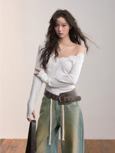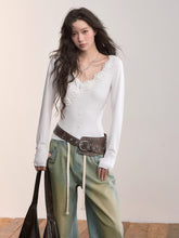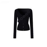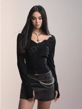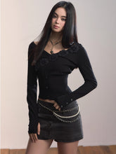 A slim, feminine long-sleeve top cut from a fine rib knit. Sculpted 3D floral appliqués trace the asymmetric neckline for a delicate, couture touch, while the rib texture gently hugs the body. A subtly cinched hem with petite buttons refines the waist and elongates the line—easy to pair with denim, tailoring, or skirts for effortless day-to-night styling.