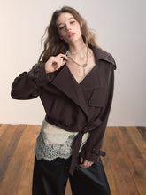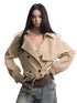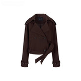 A refined reinterpretation of the classic trench, this cropped jacket blends tailored structure with soft drape for a modern, versatile silhouette. The asymmetric wrap front and self-tie waist belt create a sculpted yet relaxed shape, flattering the waistline while maintaining fluidity. Crafted from dense twill-textured TR fabric, it offers a soft, skin-friendly touch with crisp structure and breathability. Subtle luster and meticulous tailoring add understated sophistication — perfect for pairing with lace tops or wide-leg pants for an elegant urban contrast.