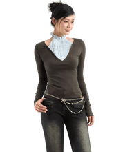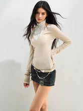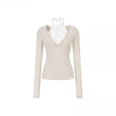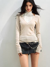 A design-driven knit top featuring a faux layered construction with a refined mock-neck insert for a modern, elevated look. The patchwork detailing creates visual depth while enhancing the illusion of a two-piece style. Cut in a slim, body-contouring silhouette, this piece flatters the figure while remaining comfortable and versatile. Enriched with silk and wool elements, it delivers a soft hand feel and subtle luxury, making it an ideal spring essential for polished everyday styling.
