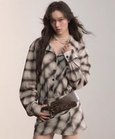 A fresh take on the shirt dress silhouette — this piece blends effortless cool with a touch of grunge-inspired charm. Crafted from 100% soft cotton with a digital plaid print, the fabric offers a smooth, breathable handfeel and a structured yet comfortable drape. The asymmetrical hemline and relaxed fit bring a laid-back rhythm, while the single-breasted front closure allows for versatile wear — buttoned up for polish or open for a casual layering look. Paired with a wide belt, it highlights the waist and adds volume contrast for a balanced, editorial silhouette.