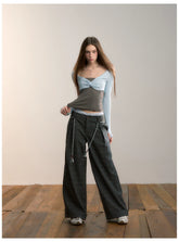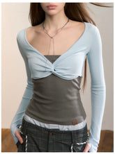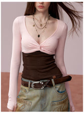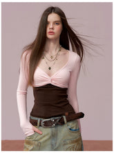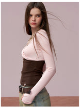 This fitted long-sleeve T-shirt features a creative patchwork design with a faux two-piece structure, combining a contrasting bandeau-style panel for a bold, layered visual effect. The slim-fit silhouette accentuates the waist and curves, delivering a confident, modern “it-girl” aesthetic. Designed with clean lines and comfortable stretch, it’s an ideal spring essential for statement styling, pairing effortlessly with high-waisted bottoms or skirts.