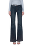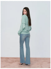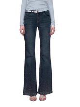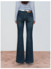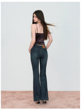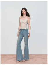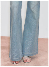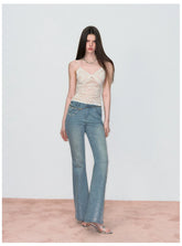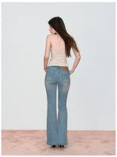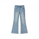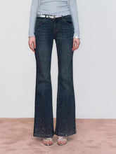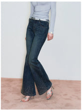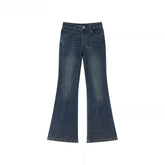 These retro-inspired denim jeans feature a subtle flared leg silhouette designed to elongate the legs and enhance a slimming effect. Finished with delicate rhinestone embellishments, they add a refined vintage touch while maintaining everyday wearability. The micro-flare cut balances classic and modern aesthetics, making them easy to style with fitted tops, knits, or blouses for versatile spring looks that feel both polished and effortless.