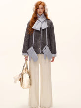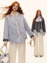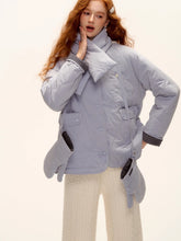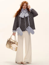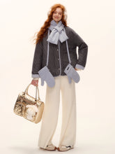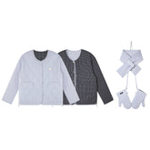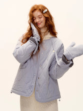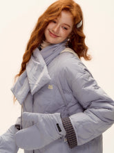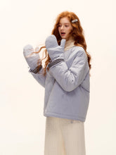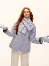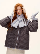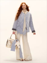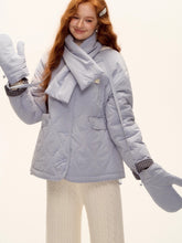 A chic and cozy three-piece set featuring a milk-blue reversible cotton-padded jacket, complemented by matching gloves and scarf. The jacket blends retro plaid detailing with a clean solid color side, allowing versatile styling for different moods and occasions. Its soft padding ensures warmth and comfort, while the reversible design adds functionality and effortless charm — perfect for a stylish winter look with a nostalgic twist.