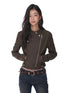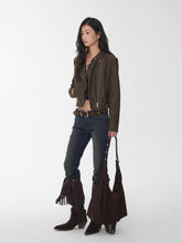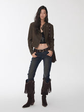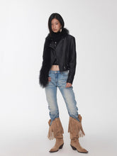 A modern reinterpretation of the classic biker silhouette, this fitted washed faux-leather jacket features a sharp cropped cut that enhances body proportions while exuding edgy individuality. The asymmetrical zip closure, multi-panel construction, and structured flap pockets with snap-button details add visual depth and a refined utilitarian aesthetic. Crafted from high-quality washed crack-textured faux leather, it undergoes a vintage water-wash treatment to reveal a distinctive aged texture and tactile richness. Finished with custom metallic hardware, this jacket balances ruggedness with sophistication — a statement piece that radiates timeless retro charm.