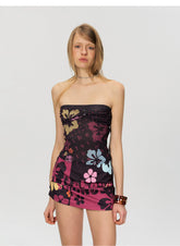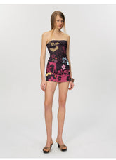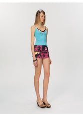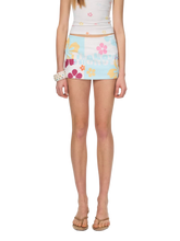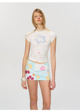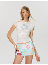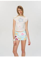 This low-rise A-line mini skirt blends playful femininity with a bold vintage-inspired aesthetic. Featuring an original floral print combined with graphic lettering, the design creates a vibrant, layered visual effect full of personality and charm. The A-line silhouette is tailored to enhance the waist while naturally elongating the legs, achieving a flattering and balanced proportion. Crafted from subtly textured twill fabric with a soft sheen, it maintains color vibrancy even after repeated wear. Built-in safety shorts provide added comfort and confidence, making it both stylish and practical for everyday statement looks.