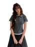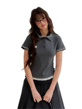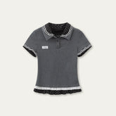 This vintage-inspired knit polo tee features a refined faux two-piece design that adds depth and layered visual interest. Crafted from soft and breathable cotton knit fabric, it offers a skin-friendly touch and excellent comfort for all-day wear while maintaining shape and resisting pilling. The design highlights delicate polka dot patchwork details paired with contrast trims, creating a charming retro aesthetic with a subtle academic feel. The double-layer polo collar enhances the layered look, while floral embroidery on the collar adds a delicate and lively accent. A tailored straight silhouette refines the shoulder and neckline lines for a flattering fit. The sleeve cuffs are finished with turned edges revealing matching embroidery details. At the waist, layered lace and polka dot panels create a slimming visual proportion. A custom embroidered logo at the chest adds subtle brand recognition, while computer embroidery and hand-sewn button craftsmanship provide a structured, high-quality finish that blends sweetness with vintage collegiate style.