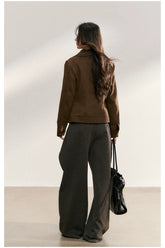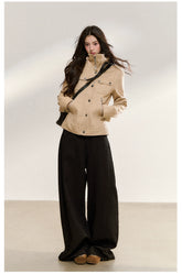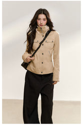 This jacket draws inspiration from classic workwear aesthetics, blending minimalist modern design with timeless tailoring. The multi-pocket structure retains the practicality of traditional work jackets, while the sculpted stand collar adds a refined, contemporary edge. Metallic buttons and zipper detailing enhance its structured silhouette, exuding a sense of toughness and sophistication. Designed for warmth and a flattering fit, the cropped cut balances utility and style — ideal for pairing with a variety of bottoms to create a chic, confident look with an industrial twist.