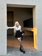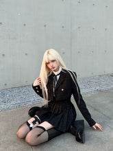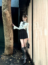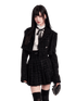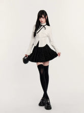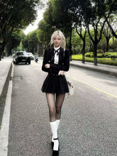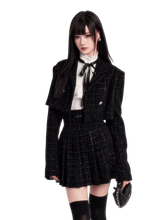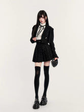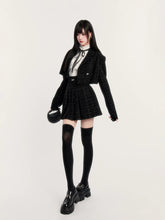 This refined three-piece set channels a dark, aristocratic aesthetic with a modern couture edge. Featuring a cropped tweed-style jacket, a crisp fitted inner shirt with bow detail, and a high-waist pleated mini skirt, the ensemble delivers a polished yet youthful silhouette. The structured tailoring enhances proportions, while the layered styling evokes a sophisticated “old money” mood with contemporary attitude. Ideal for festive occasions, social events, or elevated daily wear, this set balances elegance, structure, and statement femininity.
