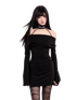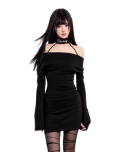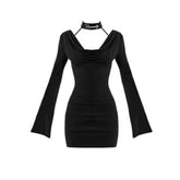This striking dress embodies a seductive dark-muse aesthetic with refined elegance. Designed with a draped cowl neckline and integrated choker detail, it frames the neck beautifully while adding a bold, sensual focal point. The stretch fabric contours the body comfortably, with a high-waist cut that sculpts the silhouette for a slimming, curve-enhancing effect. Perfect for New Year events, evening outings, or statement styling, this dress delivers confident femininity with a polished edge.