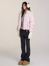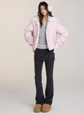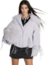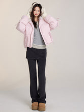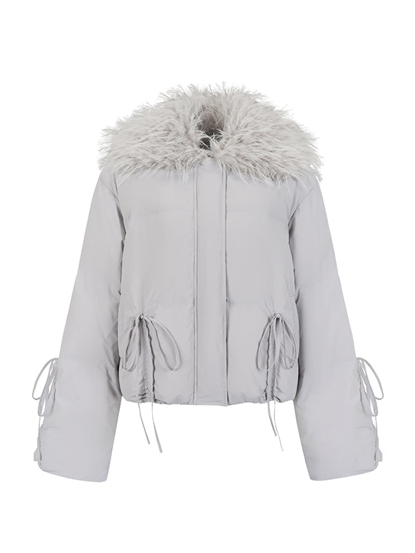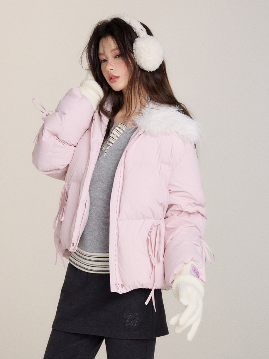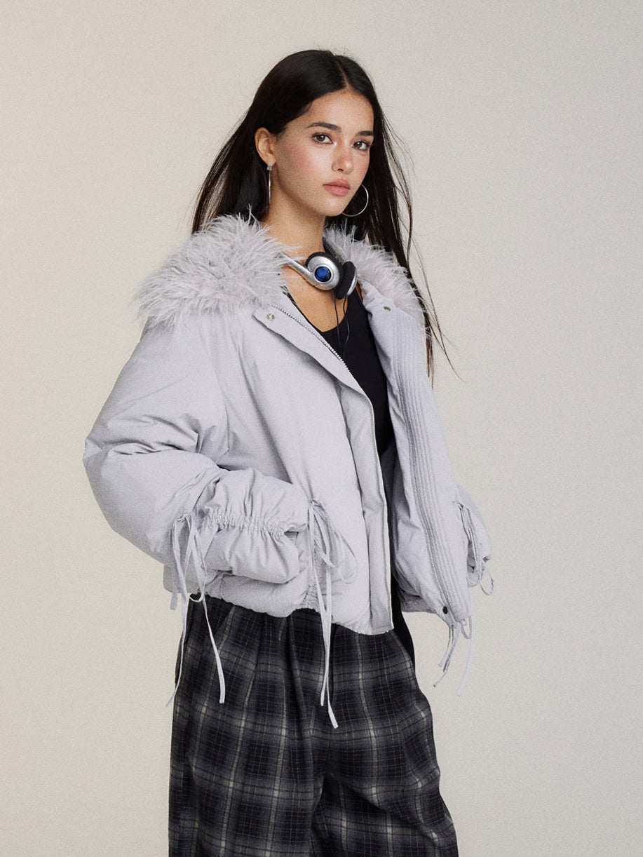 This lightweight down jacket features a stylish drawstring design and a plush fur collar, perfect for the winter season. Available in soft pink and light grey, this short puffer jacket provides both warmth and a fashionable look. With 90% duck down filling, it ensures superior insulation during the coldest months.