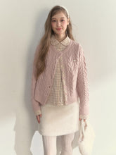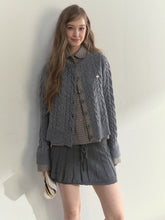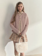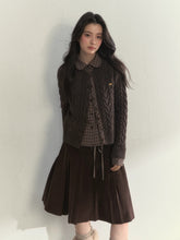 This sweater creates a beautifully layered effect with its charming doll collar design and faux two-piece construction, blending vintage academic style with modern softness. The knit portion is crafted from a luxurious wool-blend yarn for enhanced warmth and comfort. The outer jacquard texture adds richness and dimension, while the inner shirt-style plaid panels bring contrast and refined detail. The plaid-stitched placket complements the knit seamlessly, enriching the overall structure. The doll collar design flatters the neckline and softens the look, while hand-stitched metallic buttons on the chest elevate the craftsmanship. Available in warm pink or classic taupe gray, it embodies understated elegance—delicate, cozy, and effortlessly sophisticated.