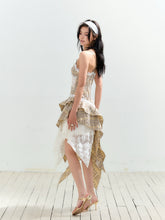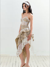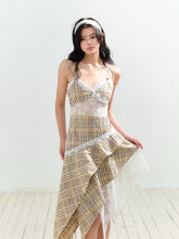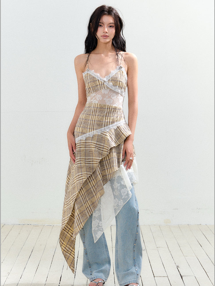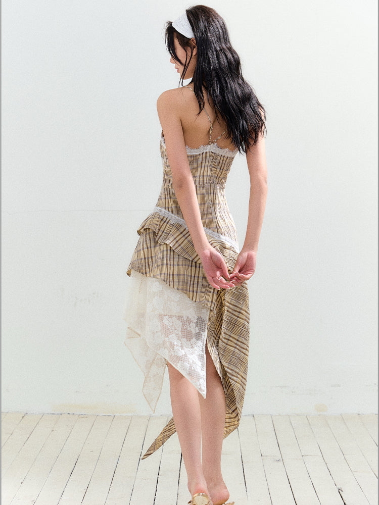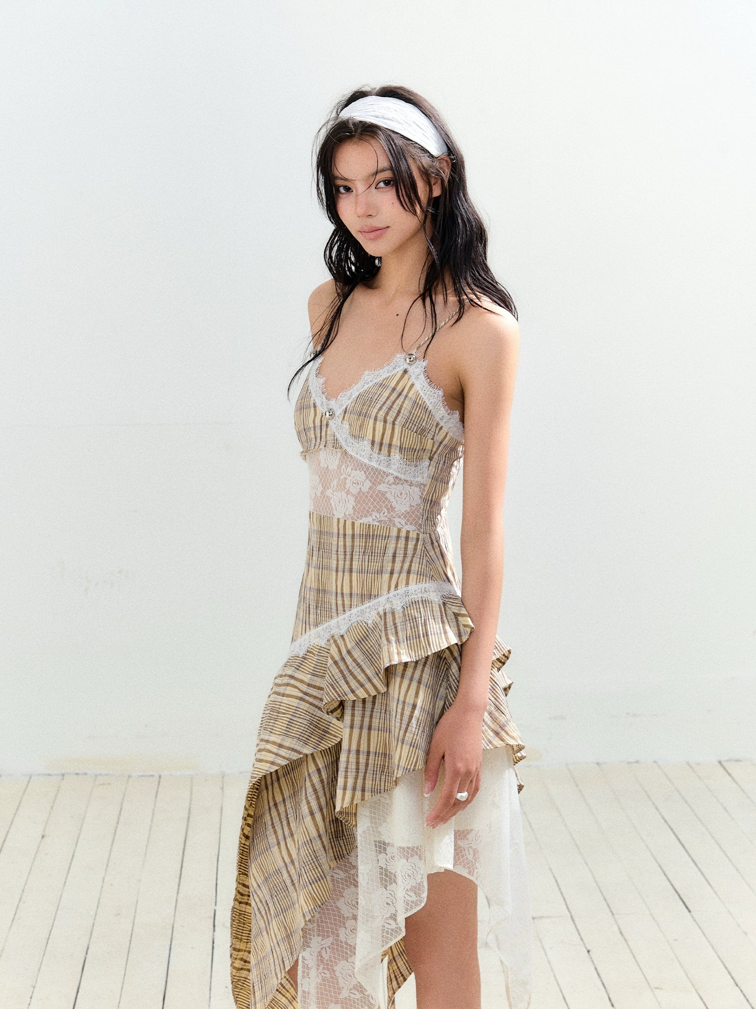Yellow Checkered Color-blocking Lace Trimmed Sling Dress - CHINASQUAD